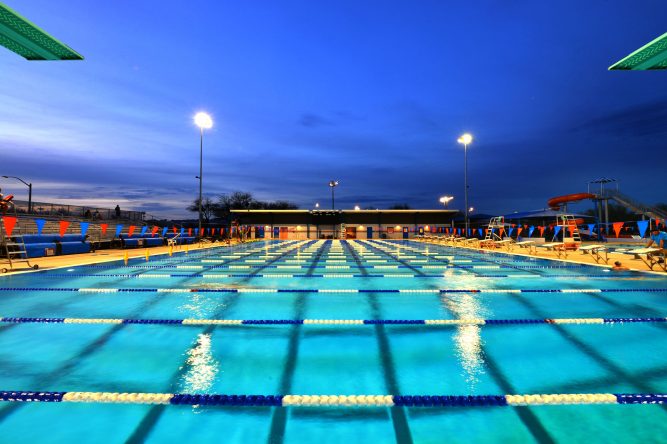 The existing deck on the 50-meter pool was raised by two feet to provide additional pool depth required to hold sanctioned national swim meets. A comp...
